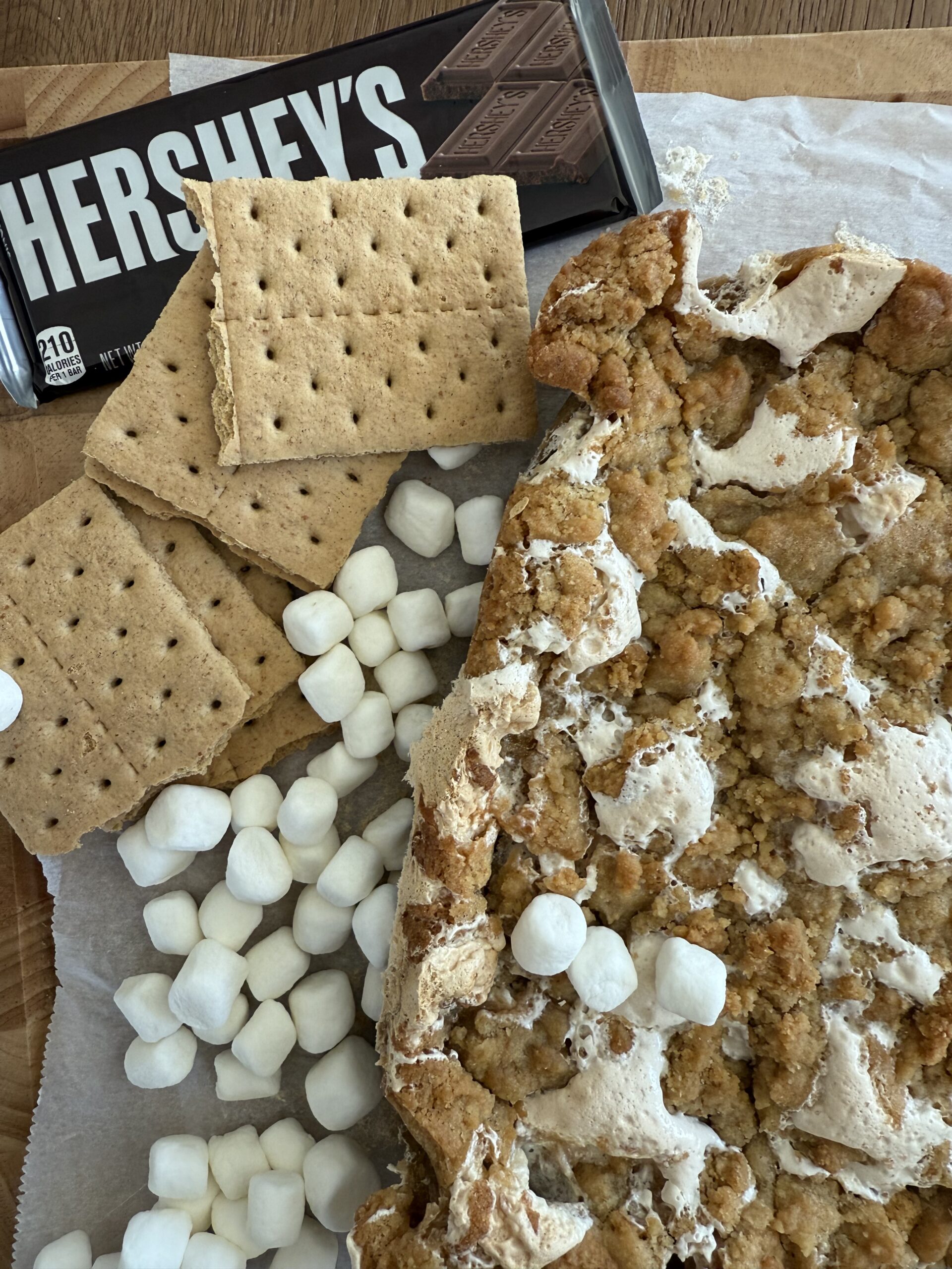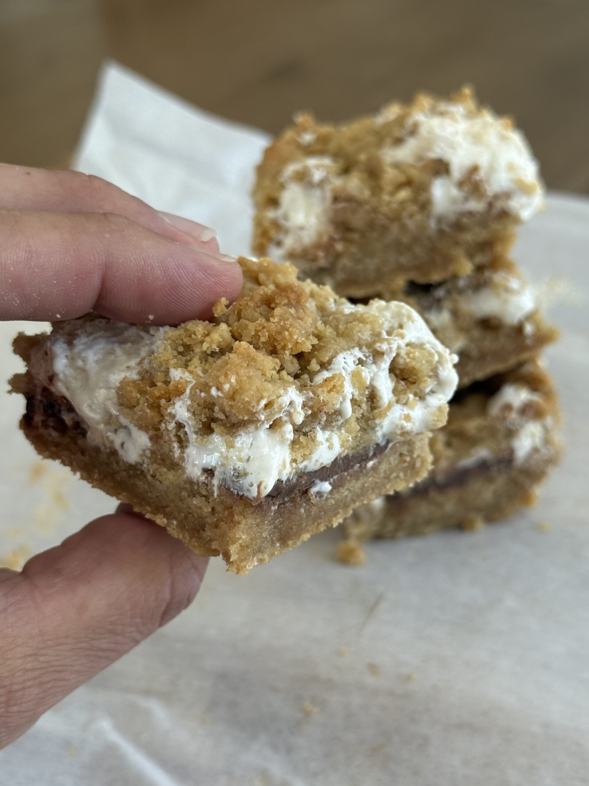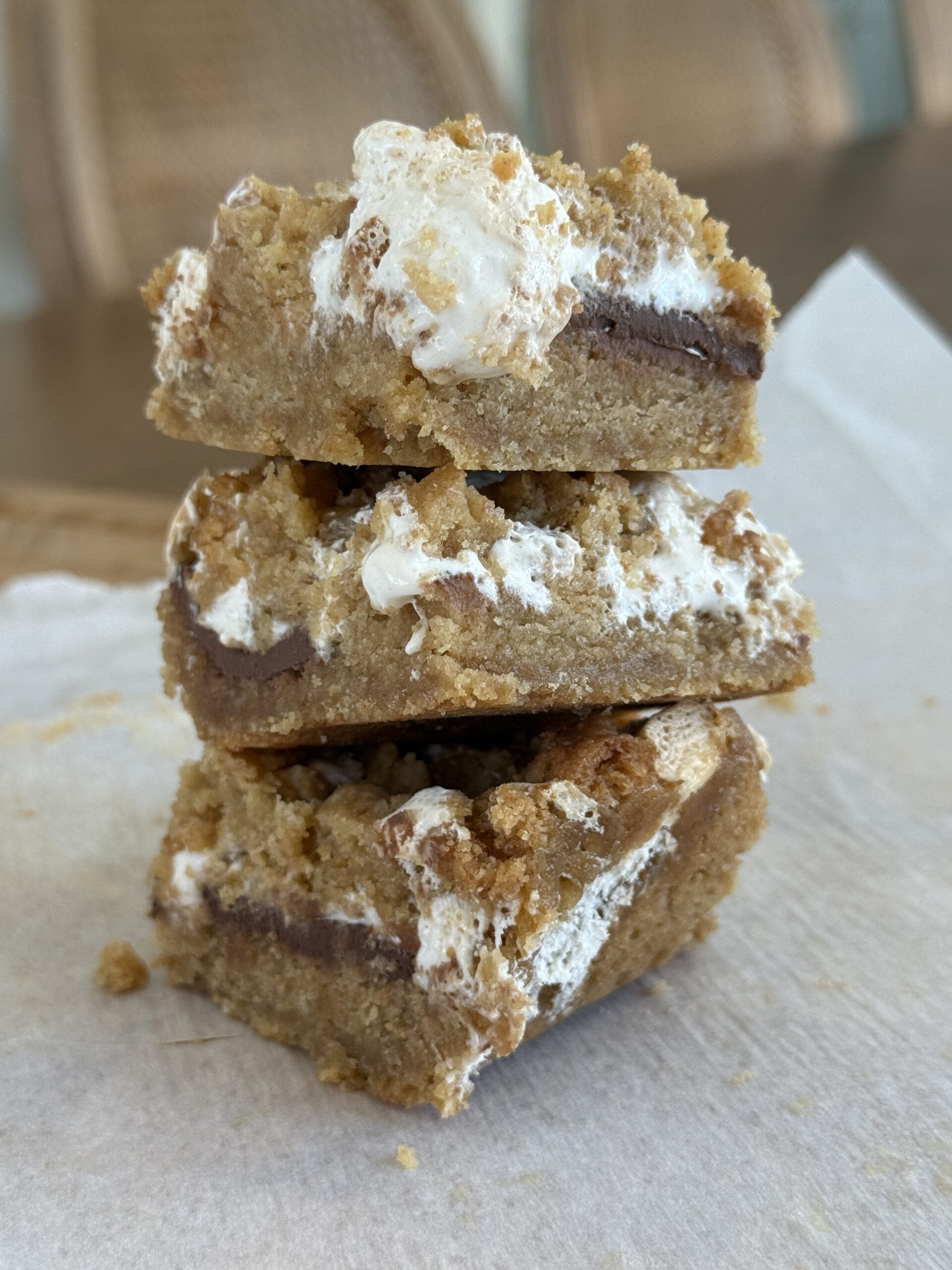 Imagine this: a thick, golden blondie base layered with crushed graham crackers, studded with chunks of chocolate, gooey marshmallows that get perfectly toasted, all sandwiched into one blondie bar. It’s everything you love about a s’more — minus the mess, plus way more flavor.